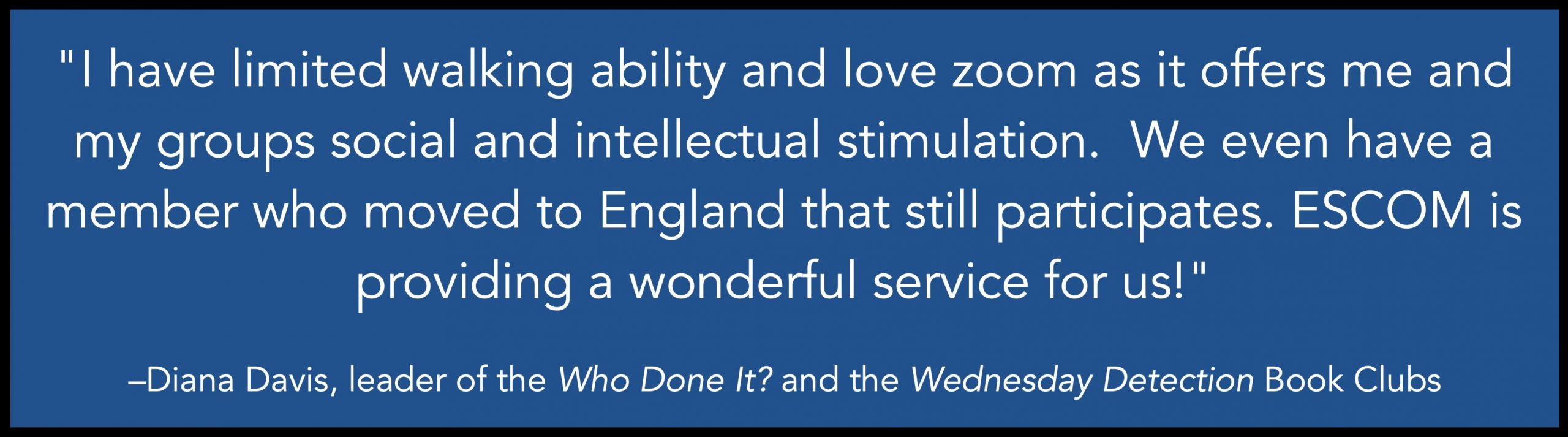 ESCOM offers Clubs for older adults and everyone else, cultivating shared interests and lifelong learning. With a broad range of topics and activities for seniors and others, they ease the isolation by connecting people in many stages of life, including retirees, students, and working adults.