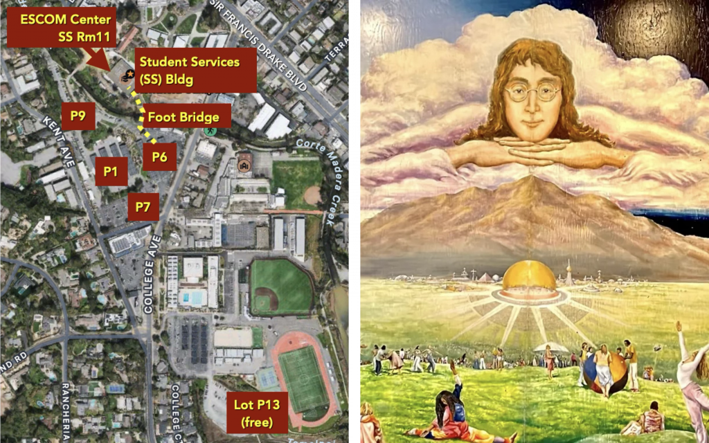 Directions: Exit Hwy 101 at Ignacio. Head west for 2.2 miles to College of Marin’s Indian Valley Campus. Drive past the green building on your left, then take the next legal left turn into Lot P2. From the bus shelter at the south end of the lot, cross the foot bridge. Walk a short distance to a cluster of buildings on the right, with stairs leading to a wooden deck. The ESCOM Center is at the end of the deck, on the left, in Building 10 (map below).